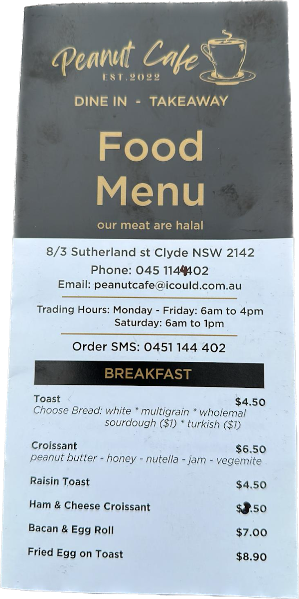 Welcome to Peanut Café, a charming eatery nestled in Clyde, NSW. This delightful café offers a range of mouth-watering dishes that cater to every taste, from hearty omelettes to refreshing salads. One standout item is the customizable Omelette, where you can choose any three toppings for just A$16.10, making it perfect for brunch lovers.